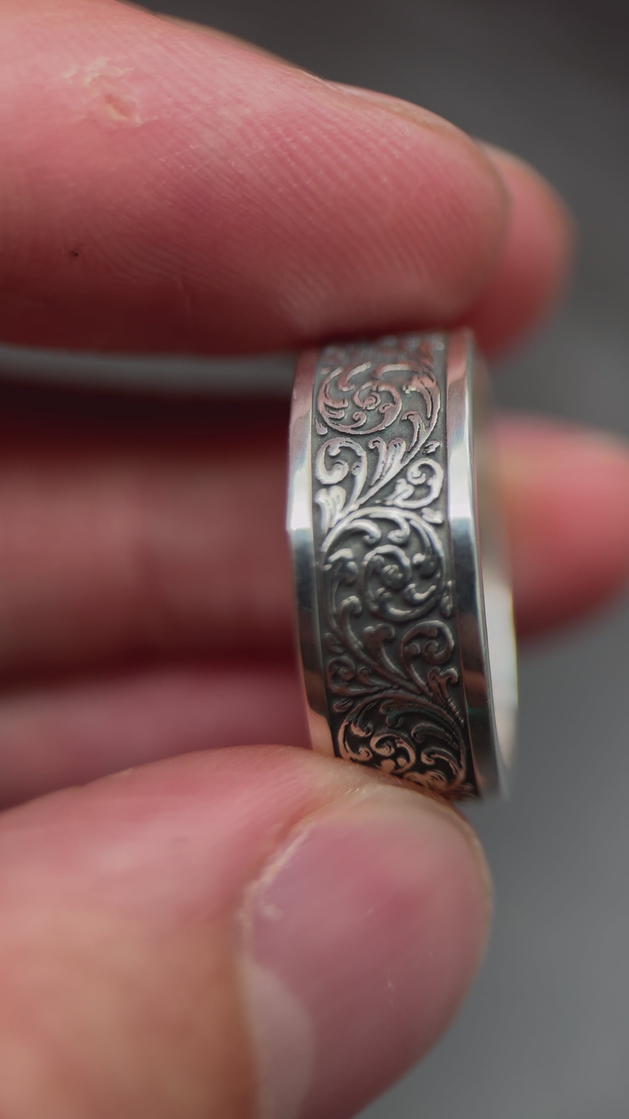 Inspired by the iconic small scroll engraving found on the legendary James Purdey & Sons shotguns and rifles, this deeply engraved sterling silver ring pays homage to Ken Hunt’s early apprenticeship in 1950. The continuous scroll motif encircles the band with meticulous detail, beautifully enhanced by an oxidised finish that highlights the engraving with dramatic contrast.