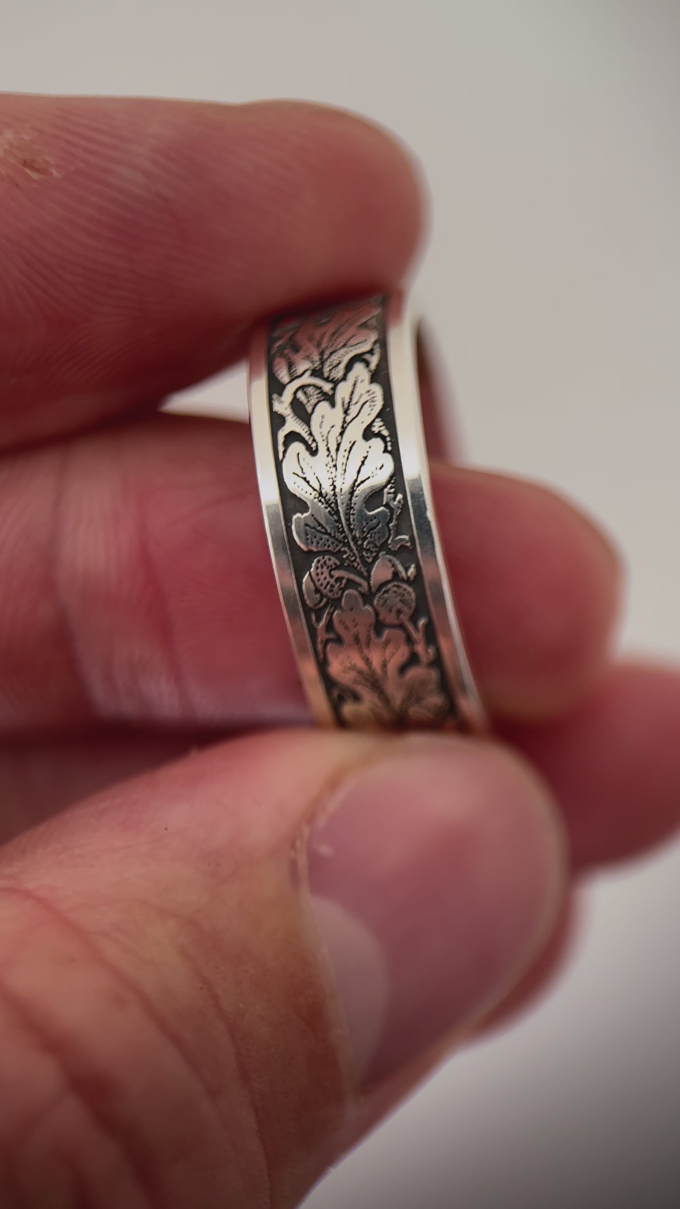 Inspired by the grandeur of the English Oak, this deeply engraved sterling silver ring showcases the timeless oak leaf motif, a design historically celebrated on the world’s finest shotguns and rifles. Crafted with precision by Ken Hunt, the continuous engraving flows seamlessly around the band, its intricate detail brought to life by an oxidised finish that creates striking contrast and depth.